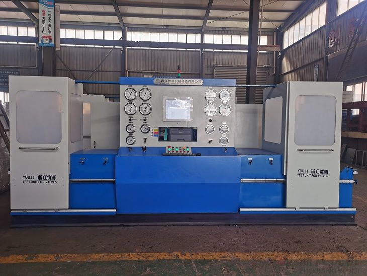 本機由液壓系統、機械部件,電器控制及多極氣源升壓裝置系統等部件組成。液壓系統是本試驗臺的動力主源。用于各類液壓缸和機械件驅動執行功能。試驗面夾爪由液壓缸直接驅動執行,軸向夾緊壓力是按閥門試驗壓力等級不同進行調節增壓(最高液壓增壓壓力31 5MPa)。各夾爪受力均,夾緊可靠。徑向移動由液壓缸傳動執行,各夾爪進退同步,靈活自如,確保通徑大小不同閥門的測試。多極氣源升壓裝置是利用液氣聯動增壓。增壓范圍0.6—32 0MPa,用于閥門介質壓力試驗。氣源升壓工作設有自動和手控二種操作選擇,當選用自動升壓工作時,工作人員可以近距離離開操縱臺觀察現場試驗情況。